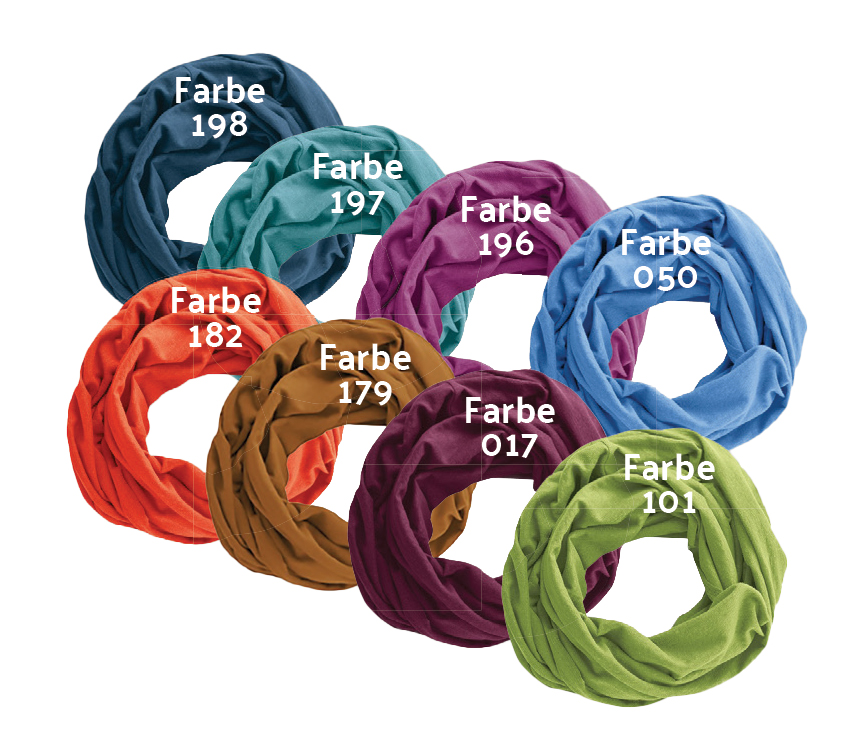 Schlauchschal für Damen aus 55% Hanf und 45% Baumwolle aus kontrolliert biologischem Anbau. Jersey Farben: reef(198), shelf(197), violet(196), ocean(050), wine(017), brick(182), almond(179) und weed(101)