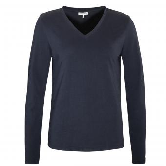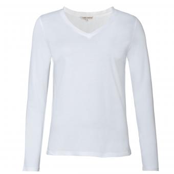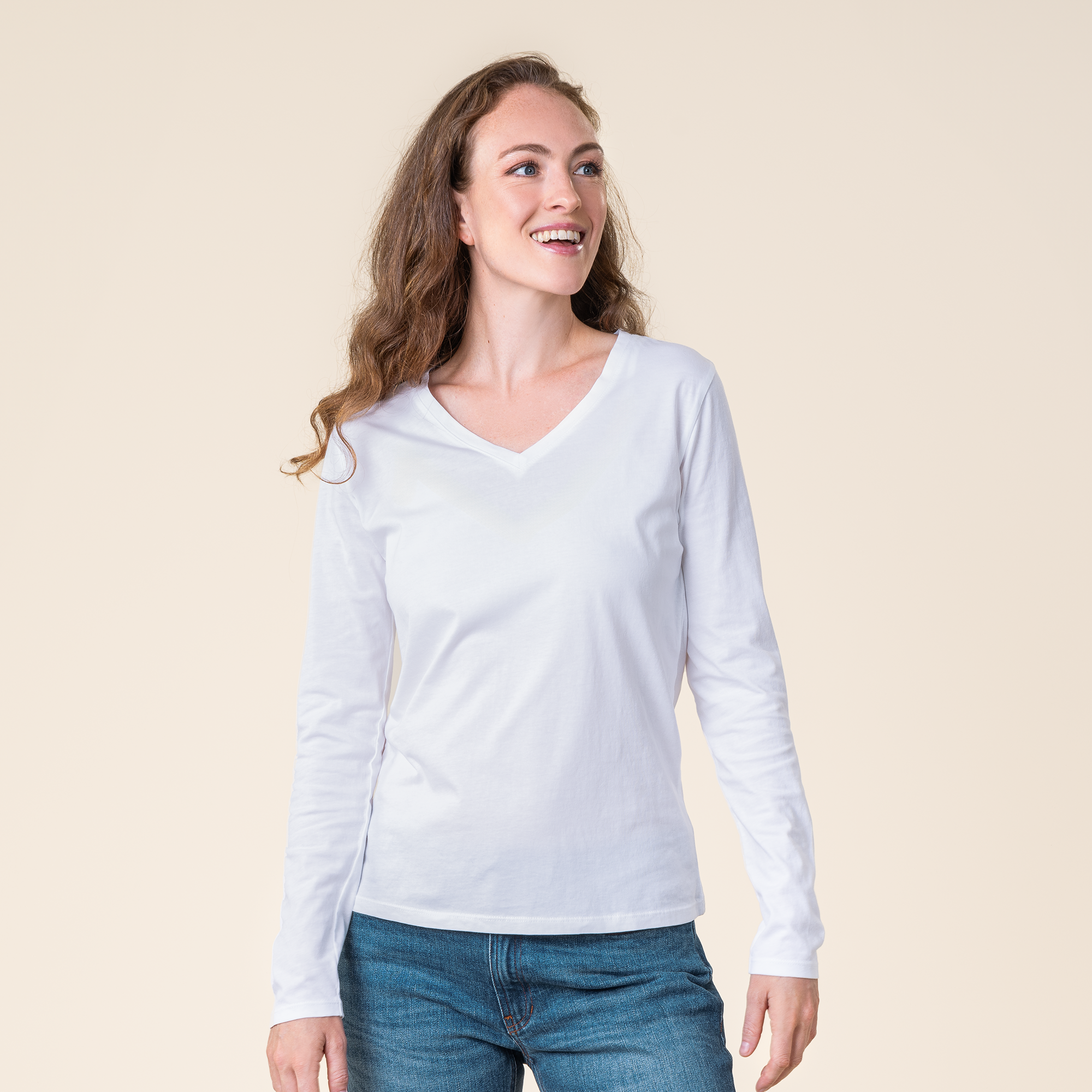 Feminines, leichtes Langarm-Shirt mit V-Ausschnitt aus 100% Bio-Baumwolle (kontrolliert biologischer Anbau). Das Garn hat eine griffige Struktur, die angenehm zu tragen ist. Das Shirt ist leicht tailliert und GOTS zertifiziert.