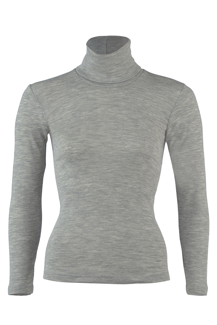 Der Rollkragen-Pullover ist zu 70% aus Wolle aus kontrolliert biologischer Tierhaltung (kbT) und zu 30% aus Seide hergestellt. Er ist GOTS zertifiziert. Farben: schwarz, hellgrau und malve