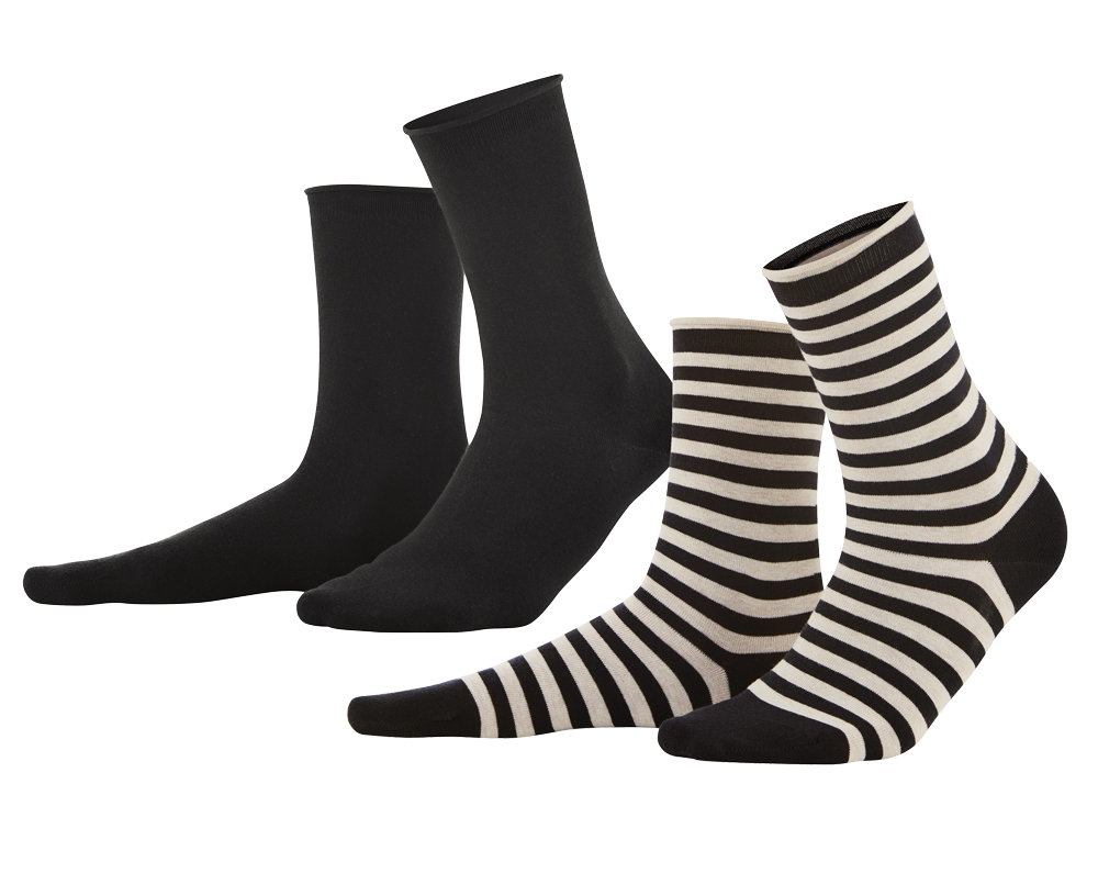 Schicke Baumwoll-Socke für Damen im Doppelpack, hergestellt aus 98% Baumwolle aus kontrolliert biologischem Anbau und 2% Elasthan. Die Socken sind GOTS zertifiziert und werden jeweils einmal gepunktet und einmal geringelt geliefert.