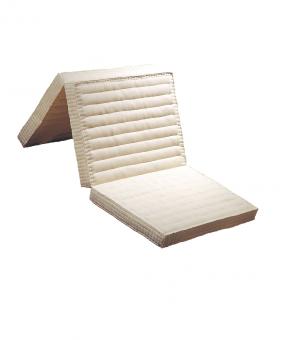 Sie ist, wie alle Kapok-Matratzen als Zellmatratze gearbeitet und besteht aus drei Matratzenelementen, die miteinander vernäht sind. Somit ist sie klappbar, dadurch leicht zu tragen und hat bei einer Standardgröße von 1 x 2 Meter nur ein Gewicht von ca. 10kg. Wird als Gästebett und Spiel-, Sitzgelegenheit gerne genutzt.