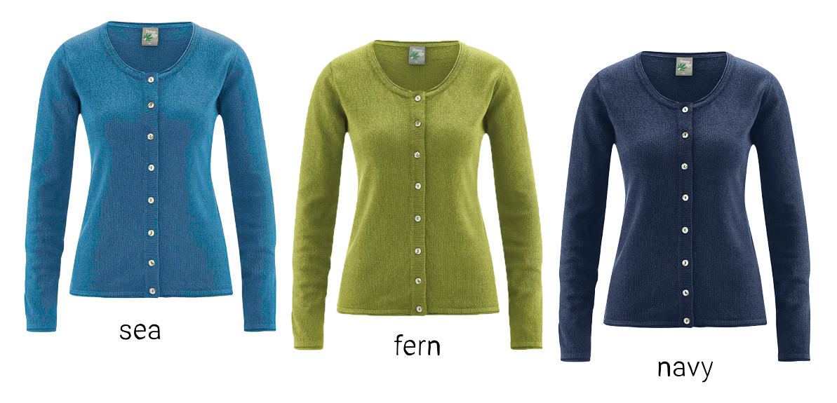 35% Hanf / 65% Baumwolle kbA, modisch gestrickt, normal geschnitten, Perlmuttknöpfe,Farben: fern, navy und sea