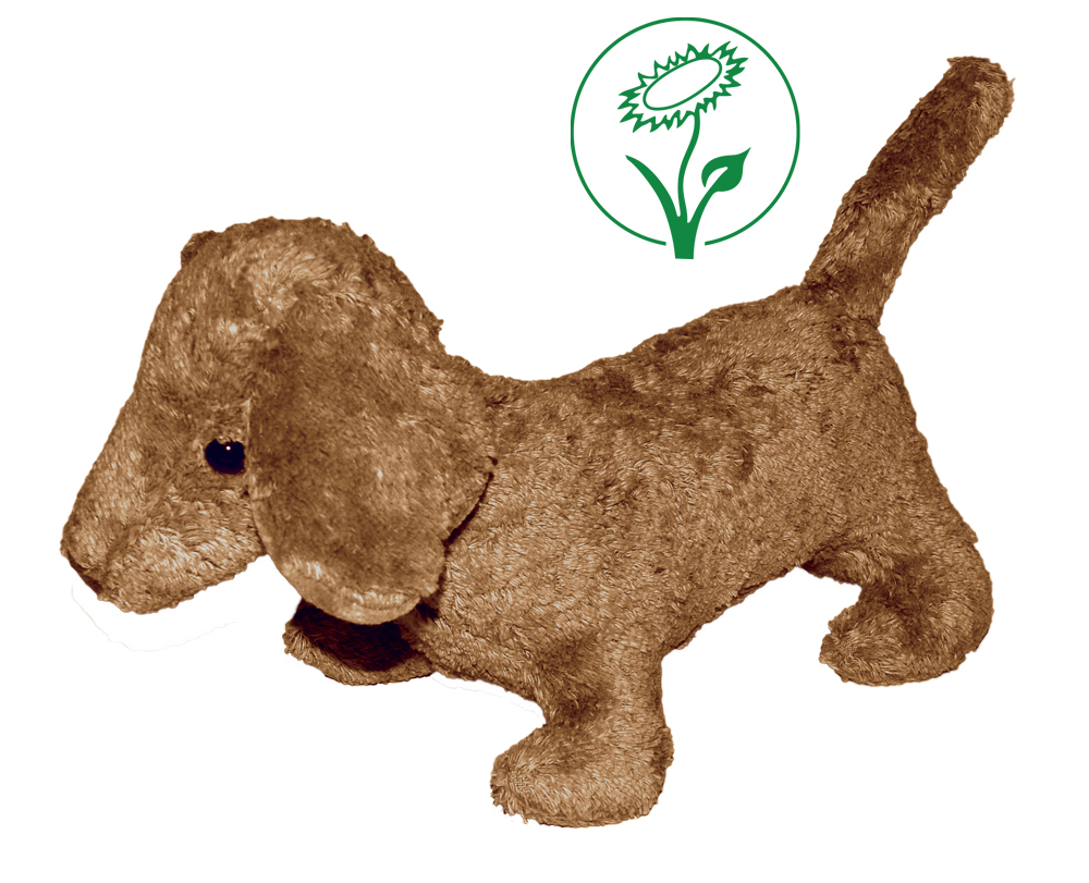Dackel "Waldi" ist VEGAN und besteht aus weichem Frottee, 100% Baumwolle aus kontrolliert biologischem Anbau, weich gefüllt mit 100% Maisfaser (ohne Gentechnik), Größe ca. 30 x 20cm.