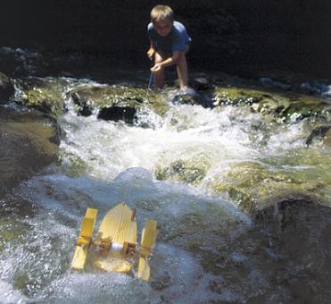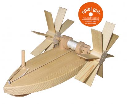 Bastelset mit Anleitung. Das Schiff, das gegen die Strömung fährt. Die Schaufelräder
