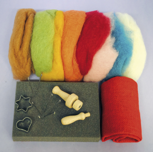 100% Bioland Schafschurwolle kbT, pflanzengefärbt, 8 Farben, Grundausstattung, 7 Filznadeln, 2 Halter, Anleitung