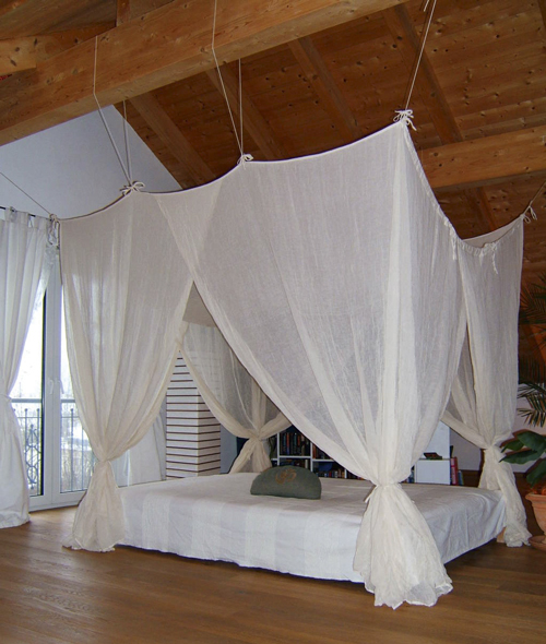 Ein Moskitonetz für vielerlei Gestaltungsmöglichkeiten. Das große Netz mit Eingängen kann direkt von der Decke gehängt werden, an abgehängten Stäbe gebunden oder über einen Betthimmel geworfen werden. Die Dachmaße lassen sich mit einer im Rand laufenden Kordel in der Länge nach Wunsch anpassen. Mit 12 Befestigungspunkten am Dachrand. 100% naturbelassene, weichfallende Baumwolle.