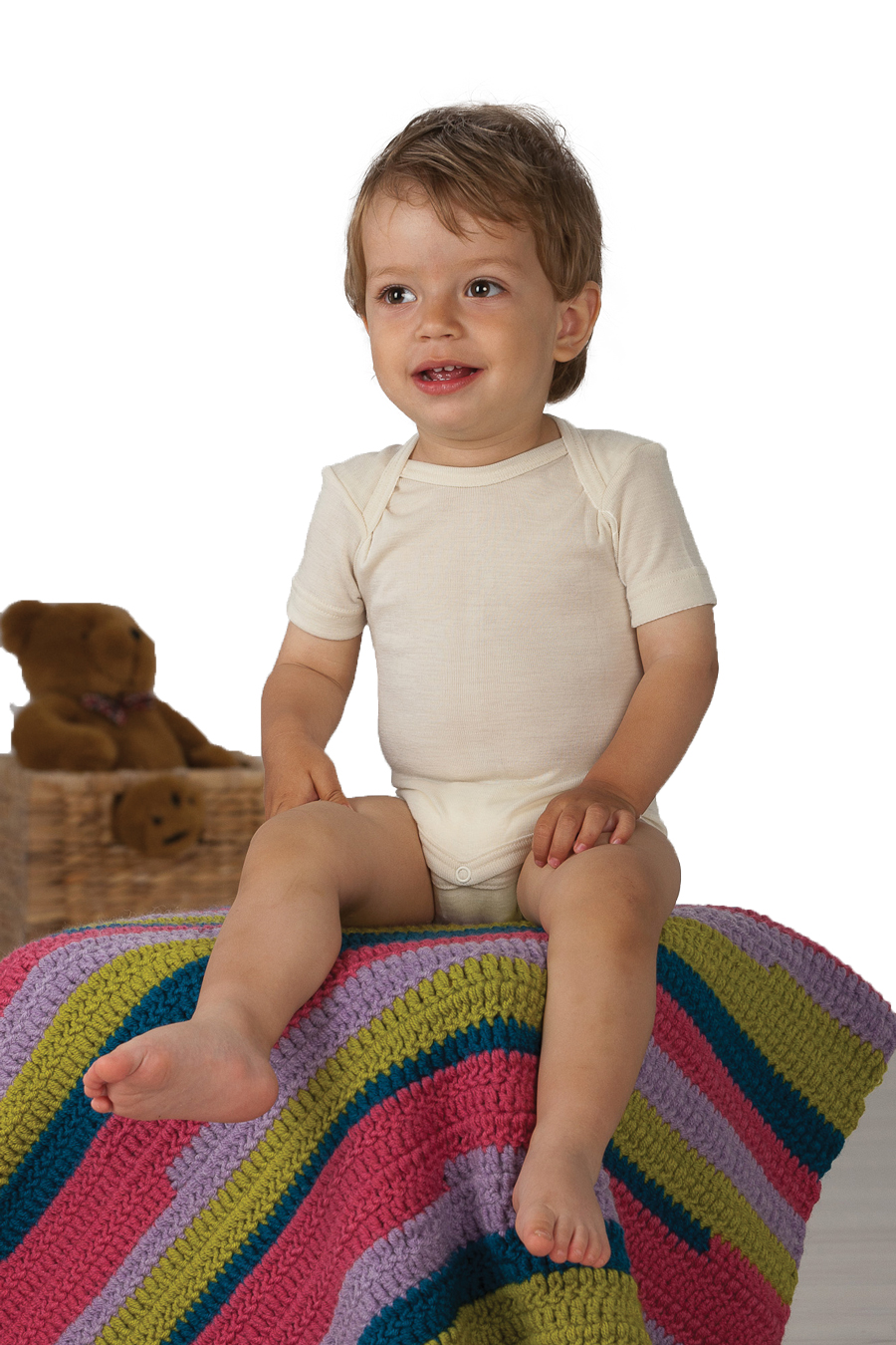 GOTS zertifizierter Body mit kurzem Arm, hergestellt aus 70% Wolle aus kontrolliert biologischer Tierhaltung (kbT) und 30% Seide. Er ist GOTS zertifiziert. Farben: natur