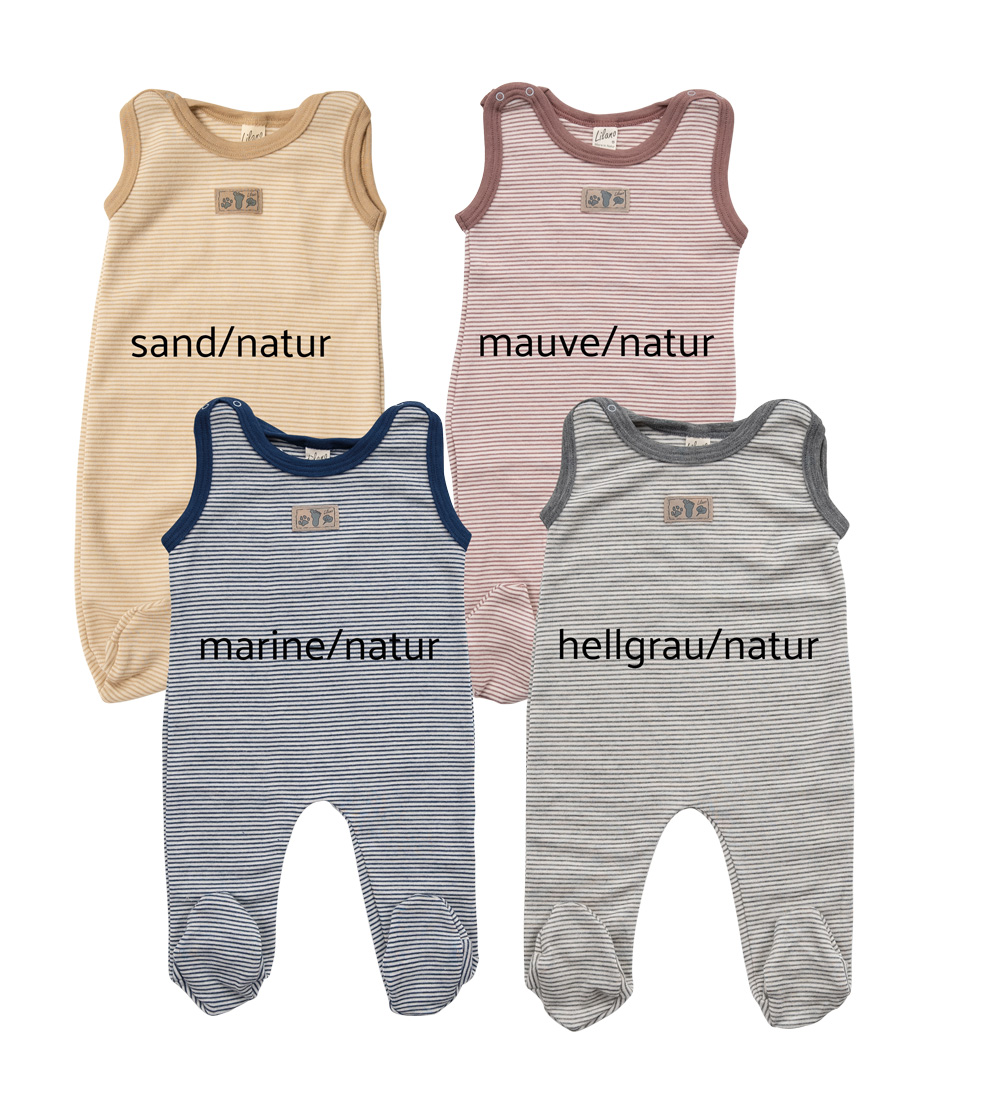 Dieser geringelte Strampler wird aus 70% Merinoschurwolle und 30% Seide hergestellt. Er ist GOTS zertifiziert und waschbar mit 30°C im Wollwaschgang. Farben: sand/natur, marine/natur, mauve/natur und hellgrau/natur