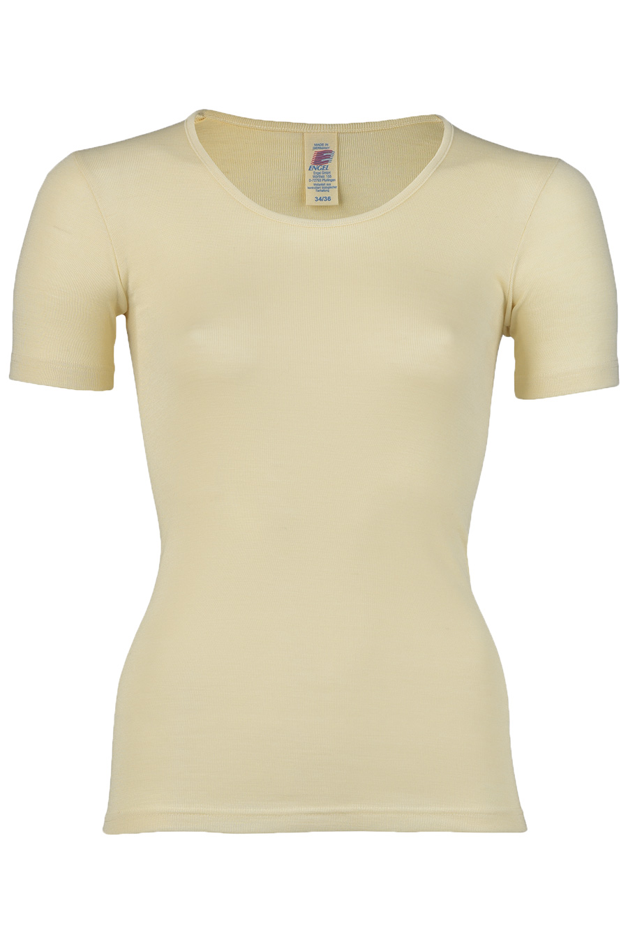 Kurzarm-Hemd mit Rundhals-Ausschnitt, hergestellt aus 70% Wolle aus kontrolliert biologischer Tierhaltung (kbT) und 30% Seide. Das Shirt ist nach strengen IVN Standards zertifiziert.