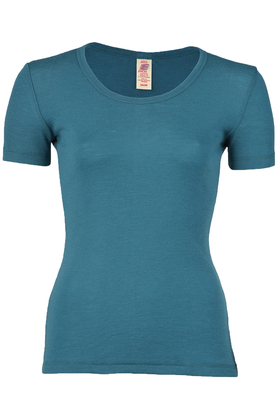 Nach IVN Standards zertifiziertes Kurzarm-Hemd für Damen aus 100% feinste Merinoschurwolle aus kontrolliert biologischer Tierhaltung (kbT). Farben: natur, safran und schiefer