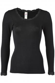 Langarm-Hemd mit Spitze, hergestellt aus 70% Merinowolle aus kontrolliert biologischer Tierhaltung (kbT) und 30% Seide. Der Spitzenabschluss am Hals und an den Ärmeln ist aus zu 90% Polyamid und 10% Elasthan. Farbe: schwarz