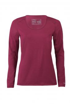 Langarm-Shirt für Damen, hergestellt in dickerer Qualität aus 70% Wolle aus kontrolliert biologischer Tierhaltung (kbT), 28% Seide und 2% Elasthan. Aufgrund der Materialzusammenstellung und spezieller Herstellungsverfahren muss das Shirt nicht so häufig gewaschen werden, sondern regeneriert beim Lüften an der frischen Luft. Das Shirt ist GOTS zertifiziert und hat einen lockeren Schnitt.
