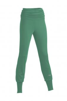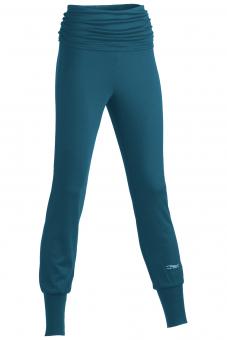Yoga-Hose mit elastischem, hoch geschnittenem Umschlagbund. Die Hose wird hergestellt aus 70% Wolle aus kontrolliert biologischer Tierhaltung (kbT), 28% Seide und 2% Elasthan. Aufgrund der Materialzusammenstellung und spezieller Herstellungsverfahren muss die Hose nicht so häufig gewaschen werden, sondern regeneriert beim Lüften an der frischen Luft. GOTS zertifiziert und mit Wollwaschmittel bei 40 Grad maschinenwaschbar.